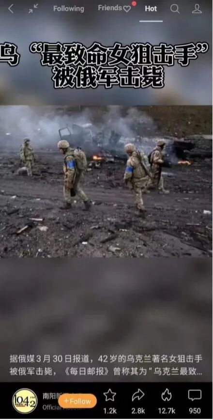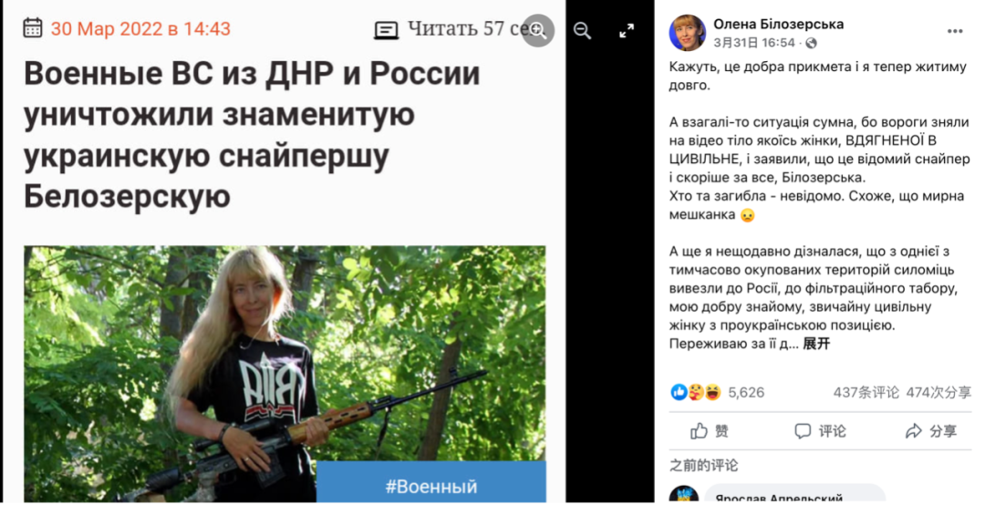 乌克兰海军陆战队著名女狙击手奥莲娜·比洛泽斯卡被俄军击毙?消息不实,已为本人辟谣。