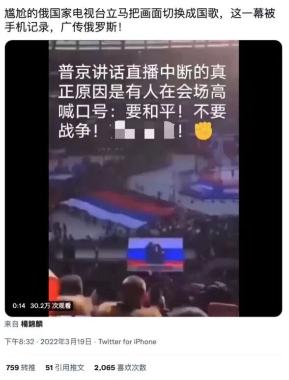 普京讲话直播中断,现场观众高呼反战口号?事件发生于3月18日克里米亚入俄8周年纪念活动。视频中,确有观众发出嘘声,但随后被“俄罗斯”的高呼盖过。