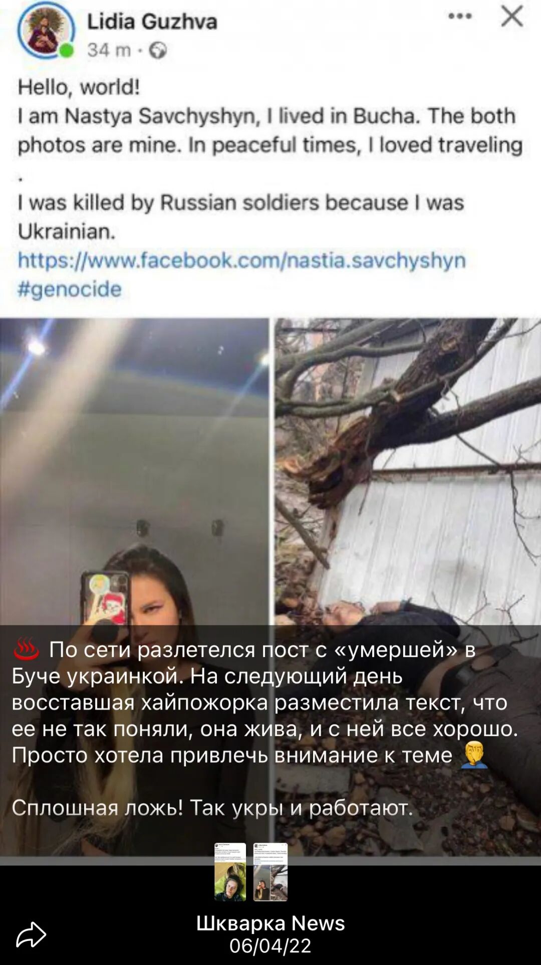 尽管如此, Lidia Guzhva转述中的漏洞引起了一些媒体和自媒体的注意。例如, “什瓦尔卡新闻”(Шкварка News)在Telegram上写道:“网络上有一篇关于布恰‘死去’的乌克兰女人的帖子在传播。第二天,这位叛变了的女人发了一条消息,说她被误解了,她还活着,一切都很好……一个彻头彻尾的谎言!”