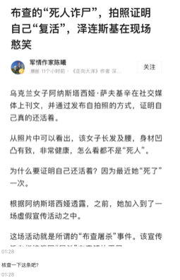 4月8日,有读者在“澎湃明查”微信公众号后台询问其中一起传闻“诈尸”事件是否属实。据“今日头条”自媒体账号所说,乌克兰女子阿纳斯塔西娅·萨夫基辛在社交媒体上刊文,自陈曾加入一场虚假宣传活动,在一张布恰的照片中扮演尸体。