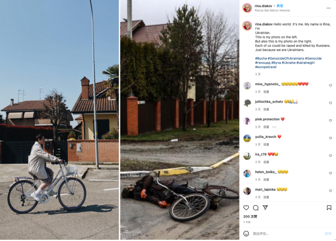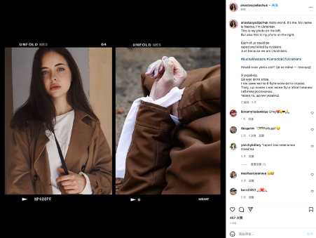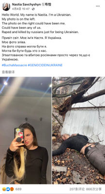 在这条状态中,Savchysyn分别用英、乌双语写道:“世界你好。我的名字叫纳斯蒂亚。我是一个乌克兰人。左边是我的照片。右边的照片本可能(could have been)是我,可能是我们中的任何一个人。就因为是乌克兰人,就被俄罗斯人强奸并杀害。”
