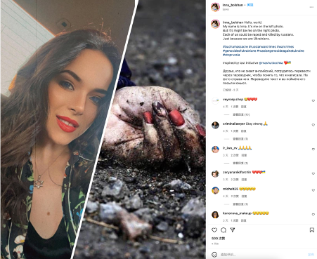 不过,值得注意的是,Savchysyn 4月4日发布的状态可以被看作一场具有更大影响力的网络运动的缩影。换言之,Savchysyn并不是唯一一个发布上述文字的用户。4月4日当天,多名现居世界各地的乌克兰裔女性模仿布恰街头的一些女尸死去时的穿着和身体特征,拍摄照片并发布到脸书和Instagram等社交平台上。这些帖子获得几百点赞,在小范围内传播。其中,关于Savchysyn的讨论最为激烈,切实将她卷入了一场舆论的风波。