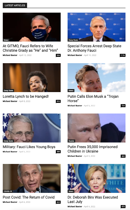 Real raw news对福奇给予了特别的关注。4月14日,官网热榜前8篇文章中,有4篇都与福奇相关,有一些被打上了“深层政府”的阴谋论标签,其中不乏“福奇迷恋小男孩”等毫无依据的“指控”。此外,一些关于美国高官、明星等公众人物被绞死(hanged)的标题也显得尤为荒诞。