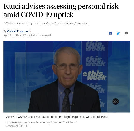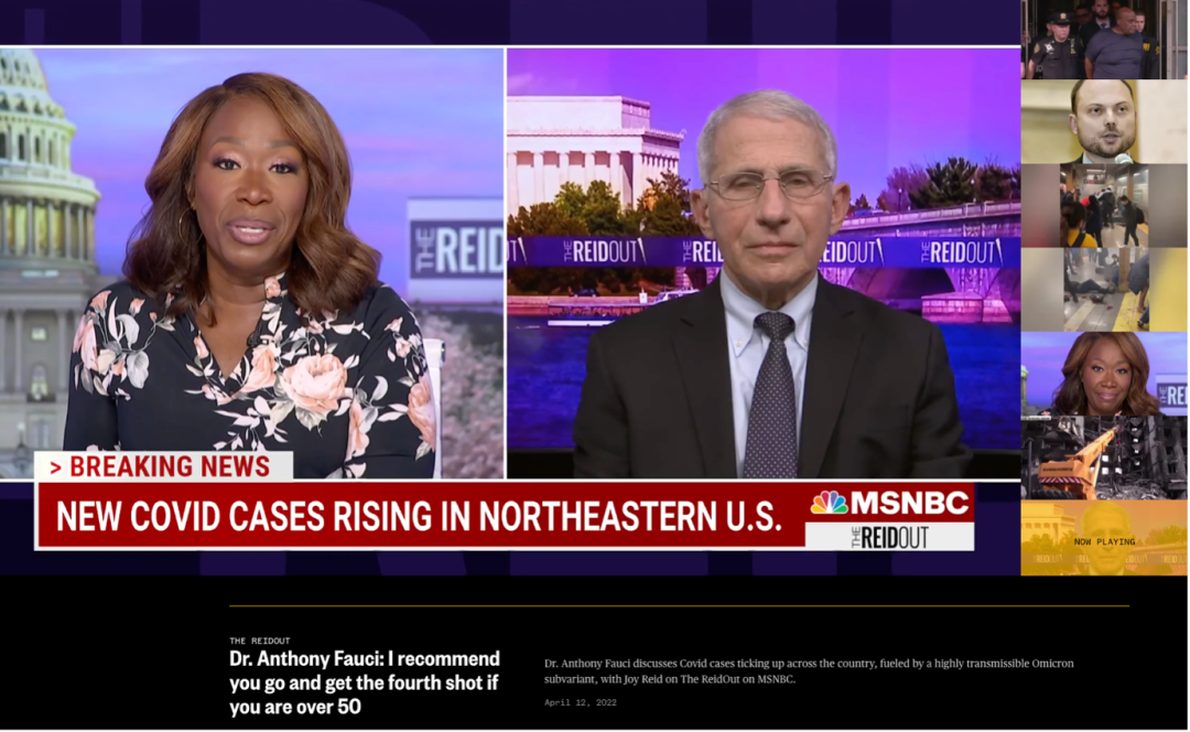 在此之后,4月12日,福奇再次公开露面,接受MSNBC采访,与主持人讨论了不久前致将近80人感染新冠的华盛顿特区烤架晚宴(Gridiron dinner),并建议50岁以上人群接种第四针疫苗加强针。