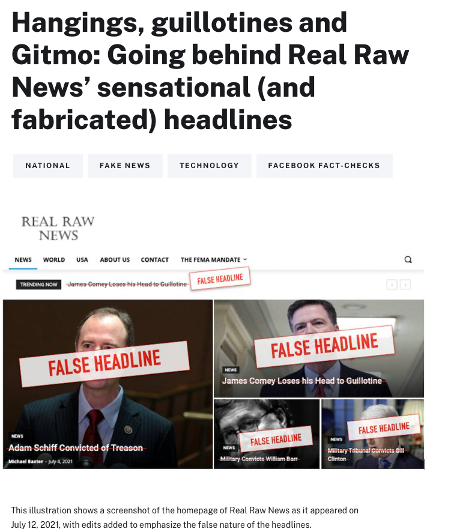 2019年9月,事实核查机构Politifact发布一则报道,批驳其炮制的“希拉里·克林顿在Gitmo被绞死”“军方处决汤姆·汉克斯”等虚假新闻标题,对其幕后运营者进行调查。开源信息显示,Real raw news背后的“迈克尔·巴克斯特”真名实为迈克尔·塔芬(Michael Tuffin)。在成立Real raw news之前,塔芬至少还运营了三个其他网站和相关YouTube频道,这些网站和频道也涉嫌宣传深层政府和外星人等阴谋论。