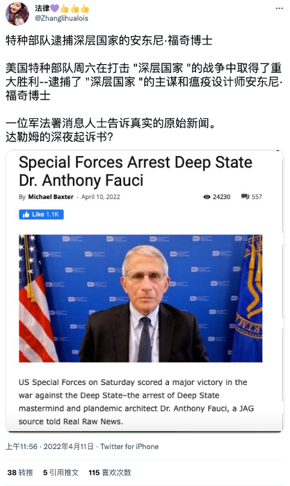 近日,推特上流传一种说法称,安东尼·福奇博士已于周六(4月9日)被美国特种部队逮捕。