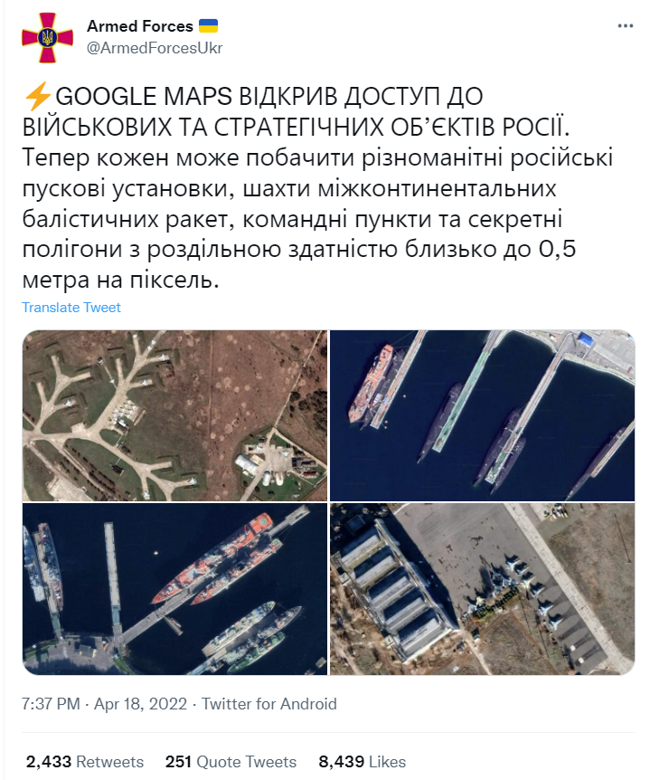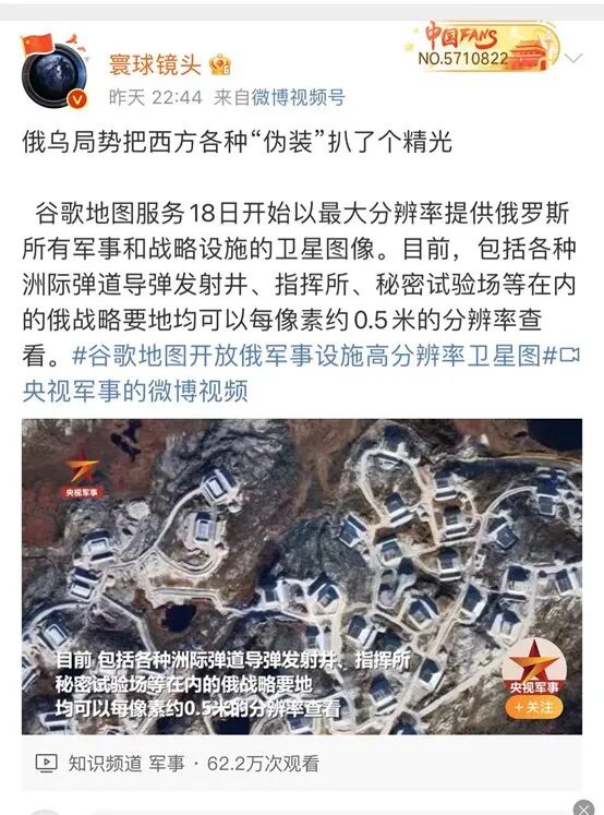 俄乌冲突爆发近两月,战火未熄。4月18日起,中文网络流传消息称,世界互联网巨头谷歌开始深度介入俄乌冲突。谷歌地图已从18日起以最大分辨率提供俄罗斯所有军事和战略设施卫星图像,包括洲际弹道导弹发射井、指挥所、秘密试验场等在内的俄战略要地现均可以每像素0.5米左右的分辨率查看。