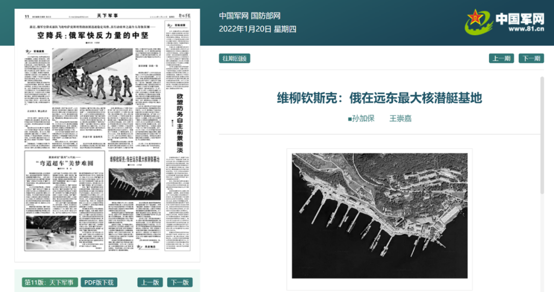 相关文章还配上了展示“维柳钦斯克核潜艇基地一角”的图片,经地形比对可以确定,此图所示地理区域与上文中提到的The Verge提供的地理坐标所显示的为同一区域。尽管《解放军报》没有提供其图源的具体信息,但窥此文可知,对世人来说,“防务新闻”公布的图片、以及维柳钦斯克拥有核潜艇基地一事本身早已不是什么秘密。