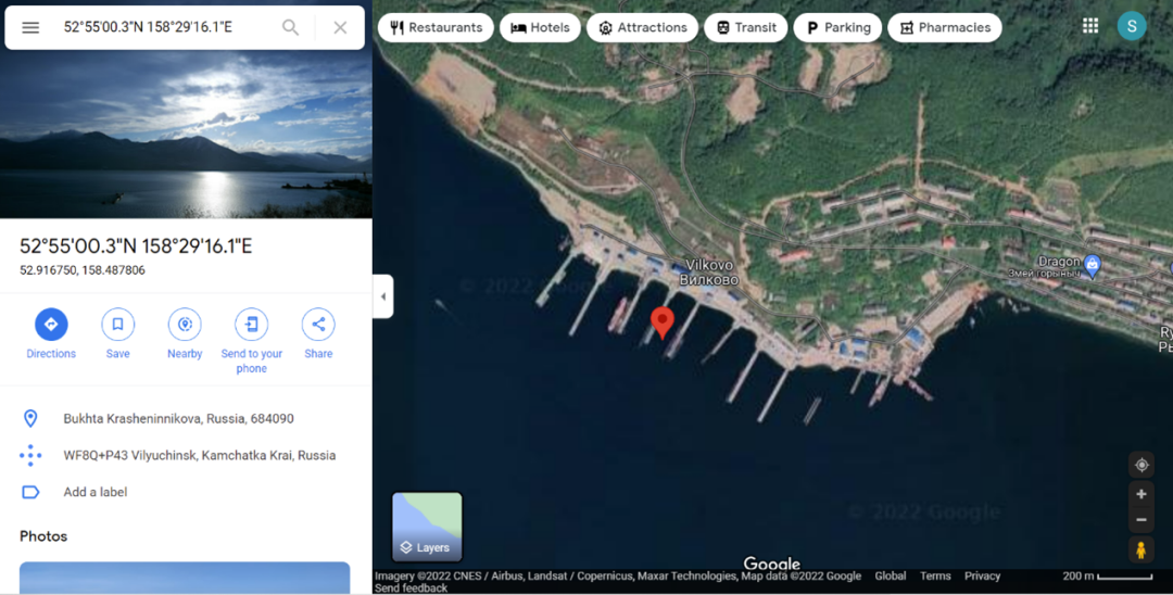 @ArmedForcesUkr和“防务新闻”发布的图片中,还有一张展示了疑似俄罗斯舰船停靠点的卫星图。美国科技新闻网站The Verge在谷歌地图上找到了该地的具体坐标,在52°55'00.3''N,158°29'16.1''E,属俄罗斯保密行政区维柳钦斯克境内。