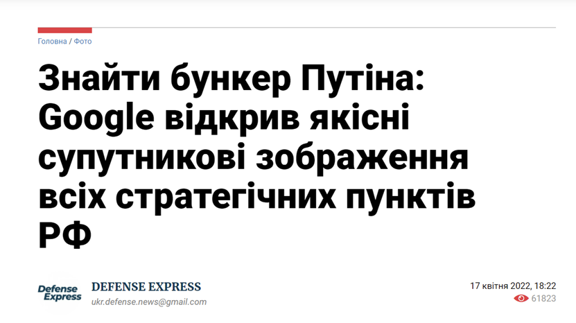 查询可知,Censor.net的文章发布于4月18日14时35分,其中确实提到了消息源Armyinform,并给出了相关消息的具体链接。Armyinform在4月18日上午11时02分发布了题为《谷歌地图开放俄罗斯所有战略地点》的文章,但同样不是网传消息的最初来源。Armyinform声称其消息依据一家叫“防务快讯”(Defense Express)的乌克兰信息资讯公司,该公司自称在国防工业政策和军事技术合作方面有20余年的经验,其使命是促进乌克兰的防务、安全和发展。
