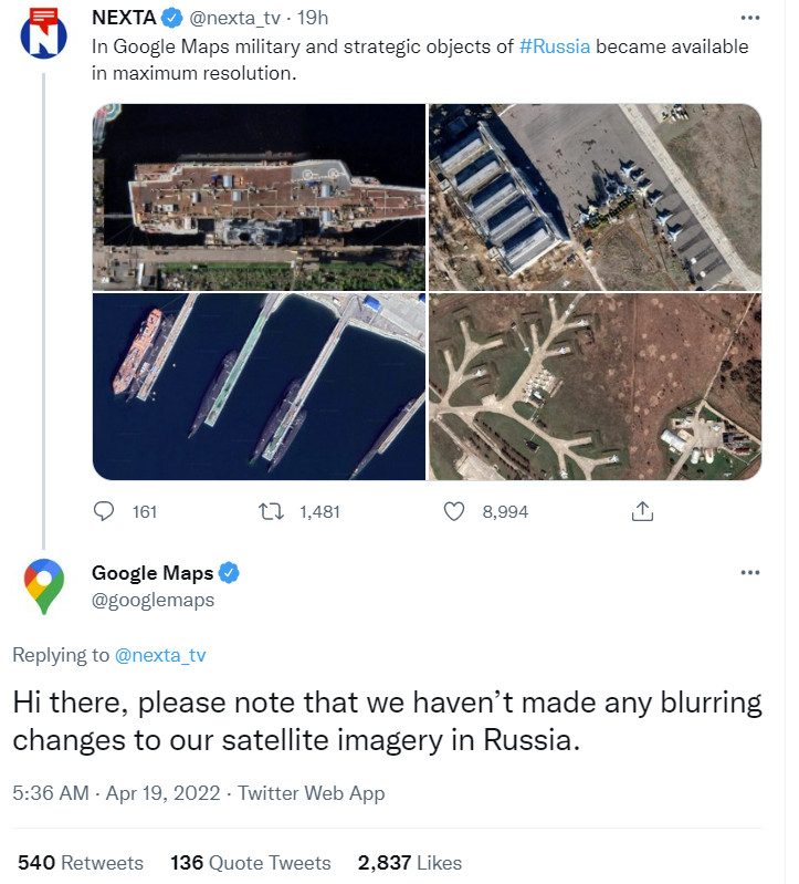 谷歌地图回应@nexta_tv,称“未对俄罗斯的卫星图片作任何模糊度上的修改。