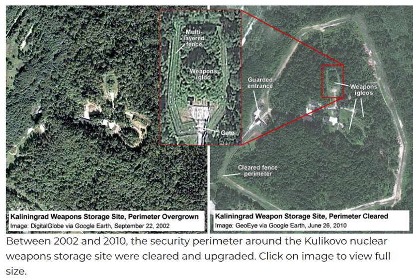 “澎湃明查”发现,2018年6月,美国科学家协会fas.org曾在官网公布过一组来自谷歌地球的图片,系俄罗斯位于加里宁格勒地区的核武器库在2002年和2010年的周边环境对比图。在2002年的图片中,人们甚至可以清晰判断出该武器库“大门”所在的位置。