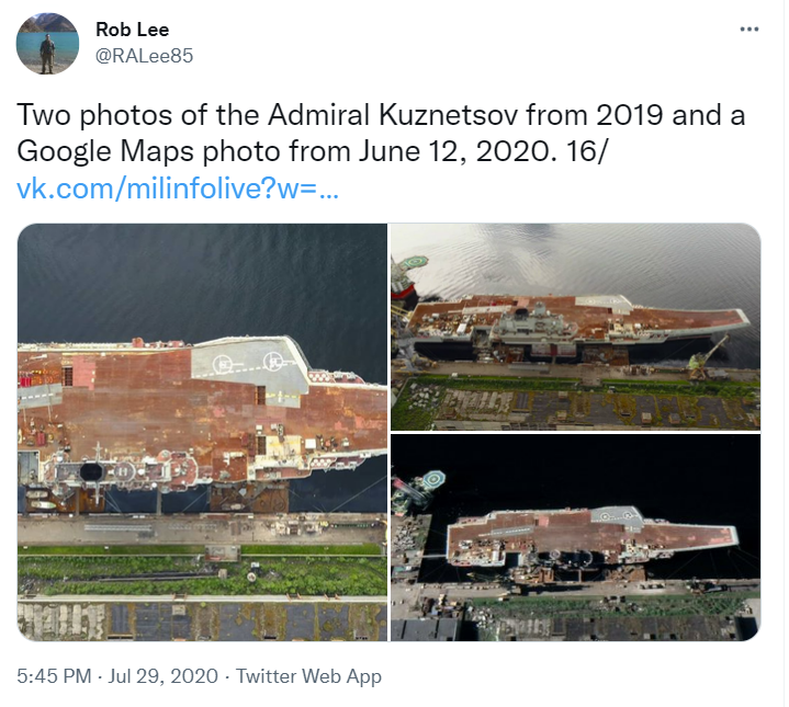 那么,谷歌地图是否真如“防务快讯”所说,是在最近才公开了俄罗斯战略要点的高质量卫星图像呢?“防务新闻”在文章中发布了一张展示俄罗斯航空母舰的图片,称得益于谷歌地图的“公开”,现在人们有可能评估唯一的现役航空母舰“库兹涅佐夫海军上将”号的工作“进展”。然而公开资料显示,早在2020年7月,推特用户@RALee85就曾在平台上传过一张来自谷歌地图的图片,展示的正是“库兹涅佐夫”号的高清卫星图像。显然,谷歌并不是在最近才“公布”了这些军事战略设施。