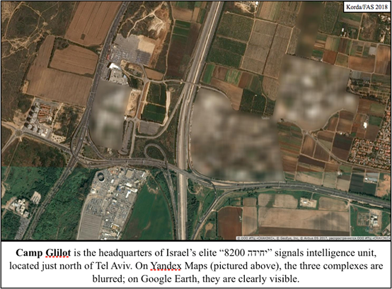 对敏感地区的模糊化处理本意在于保密,但有时,局部卫星图像清晰度的降低反而会产生“此地无银三百两”的效果。2018年12月,应以色列和土耳其相关规定,俄罗斯卫星地图供应商Yandex对此两国境内的部分敏感军事设施进行了模糊化处理。美国科学家协会却通过周边地理信息元素确认了这些被模糊地区的地理位置,发现了以、土境内的秘密军事基地。