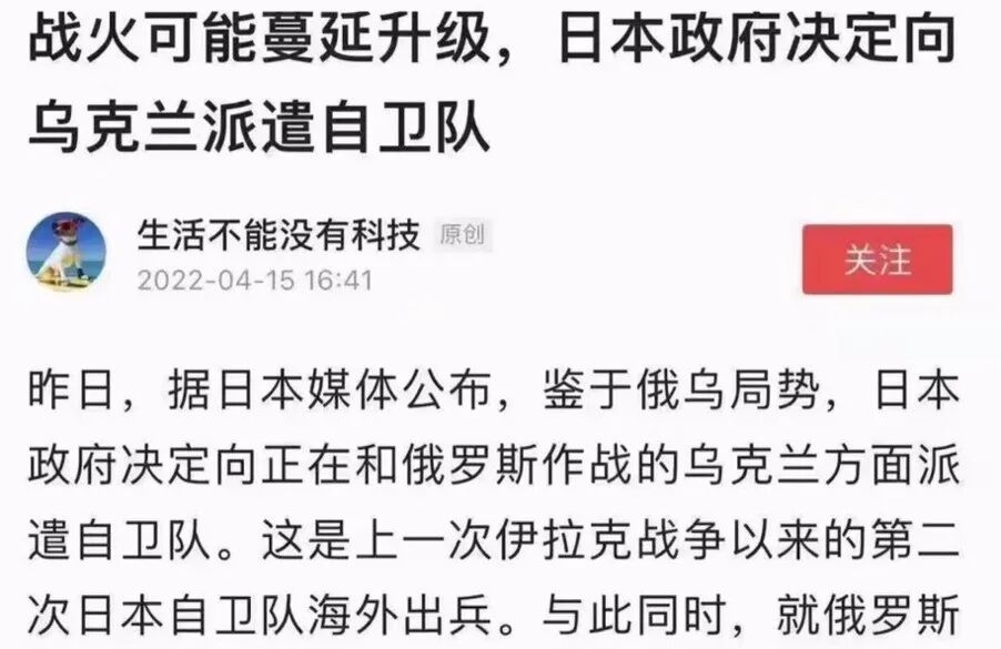 近日,“今日头条”上有自媒体账号宣称,鉴于目前俄乌冲突炮火持续升级,日本政府决定“海外出兵”,向乌克兰方面派遣自卫队。该账号还表示:“这是上一次伊拉克战争以来的第二次日本自卫队海外出兵。”