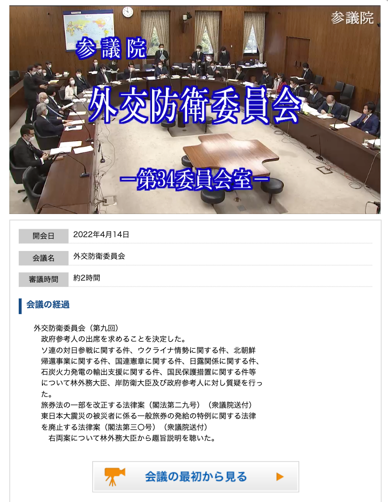 在日本参议院的网站上,可以找到这次会议的全程广播录像以及纪要。总结来说,此次会议讨论了1945年日苏战争责任归属问题、乌克兰冲突,以及朝鲜半岛局势等诸多议题。