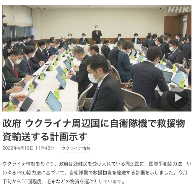在谷歌上围绕关键词“自衛隊 ウクライナ”(自卫队 乌克兰)进行搜索可以发现,日本政府确有支援乌克兰的计划,但是“海外出兵”一说却缺乏实证。日本援乌物资分为两部分,一为针对乌克兰难民的人道主义救援物资,二为无人机、化学武器防护用品,分别使用军用飞机和民用飞机进行运输。