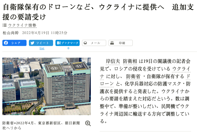 4月19日,日本防卫大臣岸信夫在记者会上表示,应乌国防部长列兹尼科夫的请求,日本将向乌克兰提供无人机及化学武器防护面罩和防护服。尽管这些设备和物资都为日防卫省和自卫队所有,但日本政府将使用“民用飞机”将之运往乌克兰邻国。