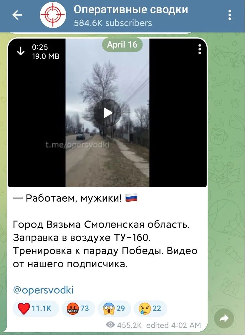 通过水印不难查出,这段视频的来源是一个名为“Opersvodki”(Оперативные сводки)的Telegram频道,发布于4月16日。发布者为这段视频附注道:“这里是斯摩棱斯克州的维亚济马市(Vyazma),我们正在排练图-160的空中加油,为胜利日阅兵作准备!“