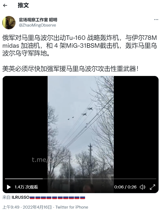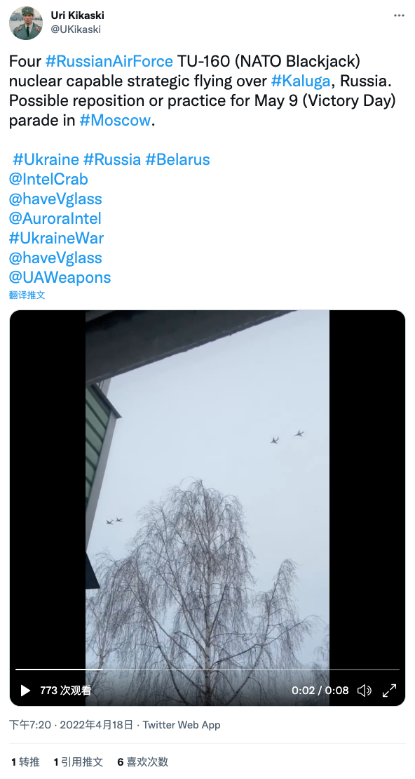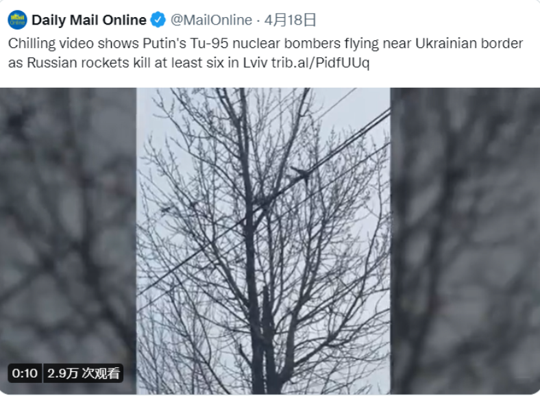 同一视频还为《每日邮报》官方推特转载。《每日邮报》称,这是俄军的图-95在乌克兰边境附近飞行。