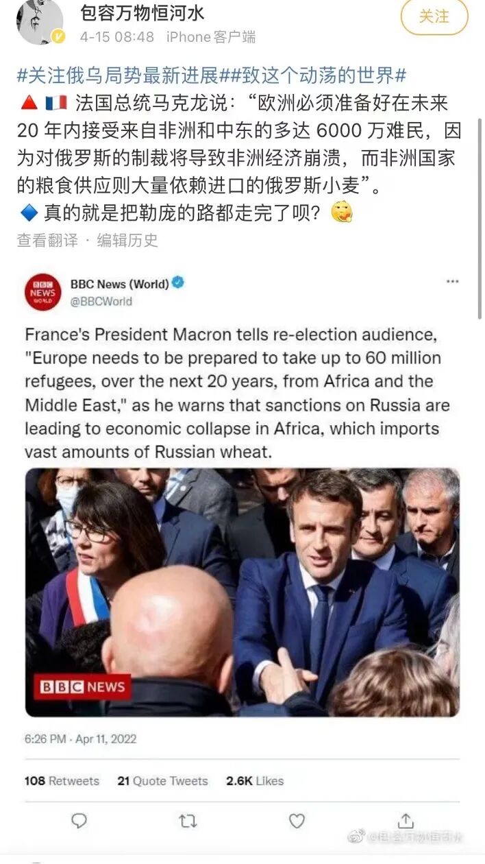 竞选期间,在国内社交平台上,有认证用户援引英国广播公司“BBC News world”推特4月11日发布的新闻截图称,法国总统马克龙表示“欧洲必须准备好在未来20年内接收来自非洲和中东的多达6000万难民”,其原因在于对俄罗斯的制裁影响非洲粮食供应,继而导致非洲经济崩溃。该截图随后被多个微博博主转载发布。