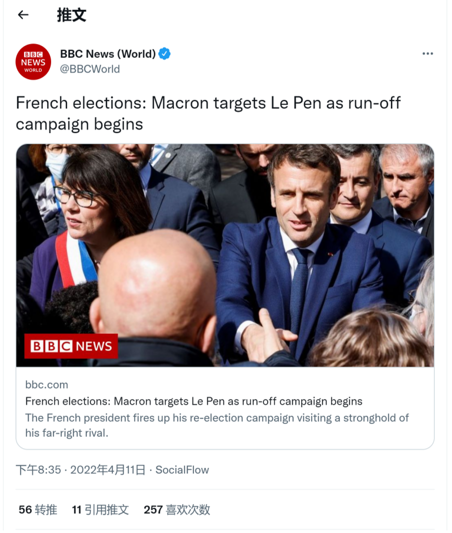 BBC 4月11日发表的关于法国大选第二轮竞选的报道截图。