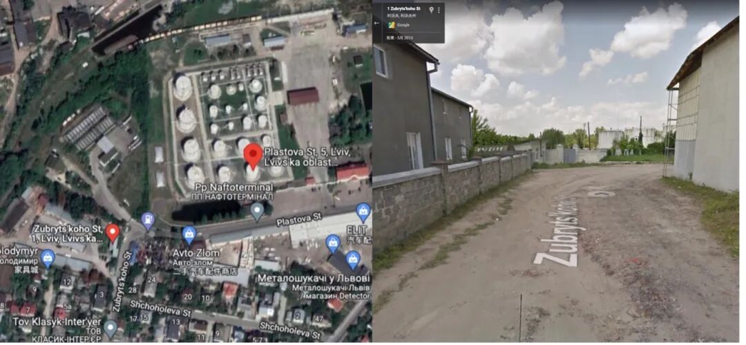 在谷歌地图中输入以上热异常地点经纬度坐标进行查证,并将街景同原报道中雷蒙身后的环境进行对比,可以推断视频拍摄地位于利沃夫市中心Zubryts’koho大街。谷歌街景中该方位左侧的矮墙、背景中白色圆柱状的燃料库,以及右侧部分铺有瓷砖的建筑物外墙(见下图),皆与CNN报道中环境特征相符。而远处火光冲天的燃料库群,位于与Zubryts’koho大街垂直相交的Plastova大街上,大致经纬度为49.51N、24.03E。
