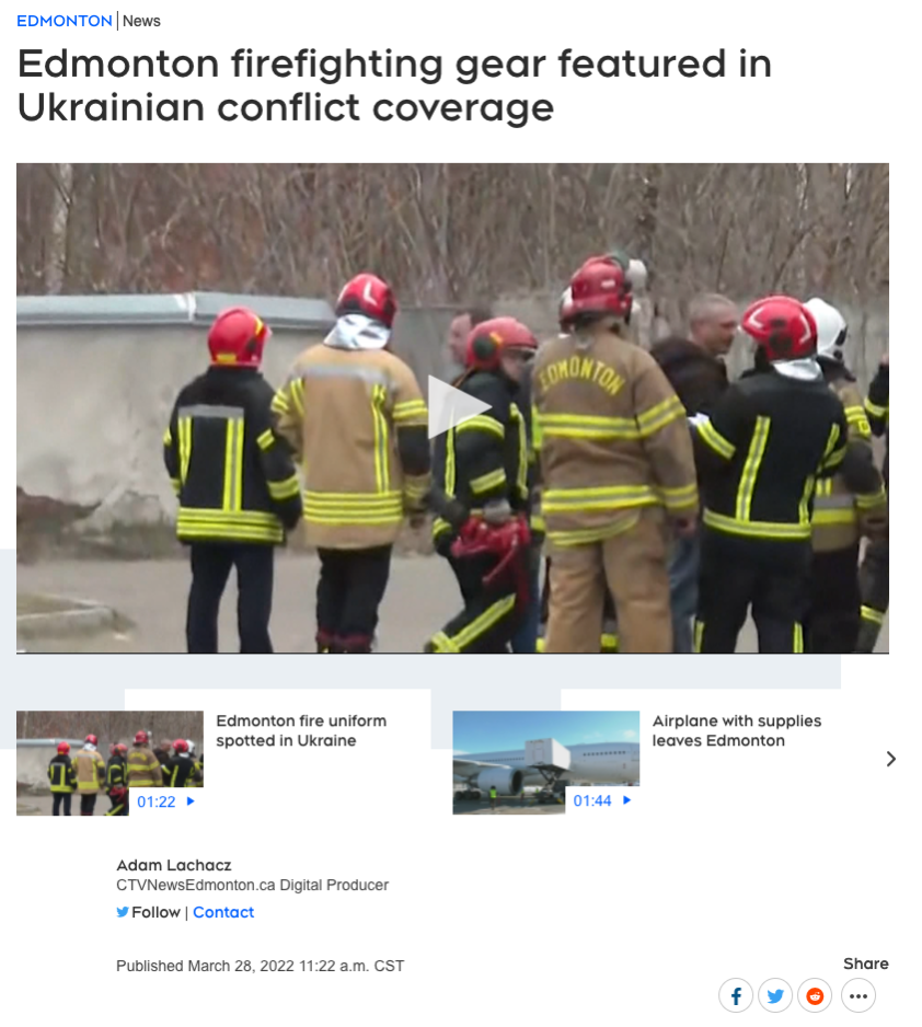 综合以上线索可以确认,由唐·雷蒙出镜的CNN报道确实拍摄于利沃夫,而不是加拿大城市埃德蒙顿。那么,印有“埃德蒙顿”字样的消防员外套,又为何会出现在万里之外的乌克兰呢?