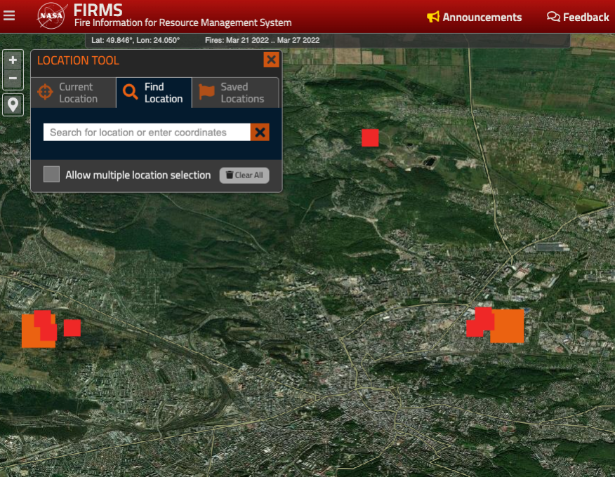 利用NASA的热异常卫星图像(FIRMS),将时间锁定在3月27日至之前一周,可以发现当地时间3月27日,利沃夫市内及周边曾有多地出现热异常,发生疑似火灾事故。
