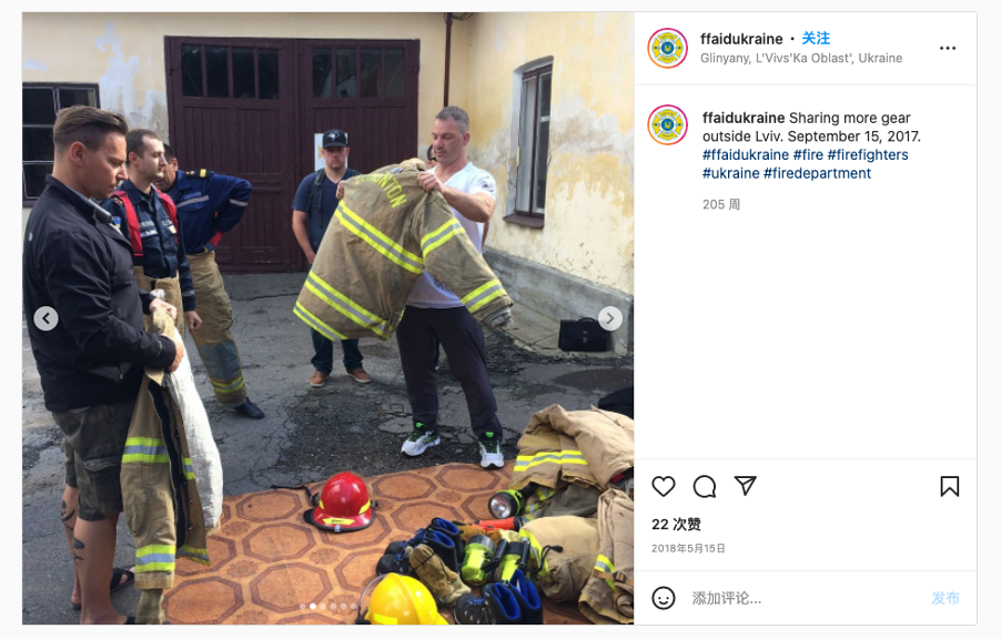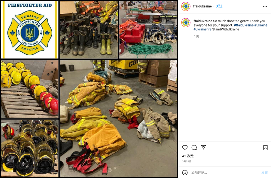 除此之外,在“消防员援助乌克兰”的Instagram主页(ffaidukriane)上,也可以找到外套捐赠活动现场的照片。最近一次是在3月25日,照片中地上摆放有同款土黄色外套。