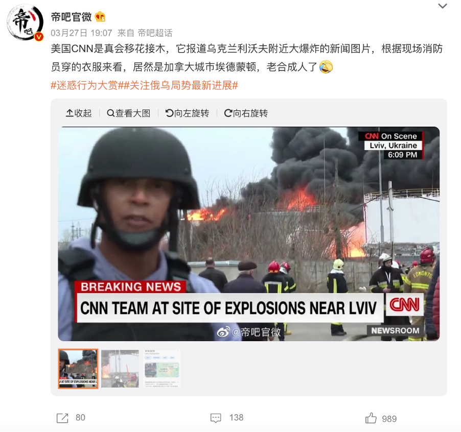 例如日前,海内外社交平台上有一种说法称,CNN在报道时用加拿大城市埃德蒙顿的图片充当乌克兰利沃夫附近大爆炸。那么,这一次,CNN是否果真“移花接木”“缝合”报道?