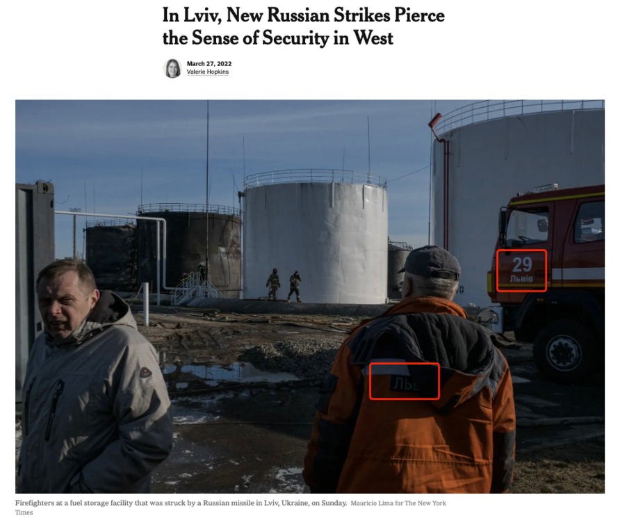 搜索关键词“oil terminal Lviv”,并将时间限定在3月27日后发现,同日,《纽约时报》亦报道了这起事件。文章配图为雷蒙所站处目之所及白色圆柱体建筑的近景。而《纽约时报》所使用的这张照片中,有两处出现乌克兰语单词。消防车上的字样为“29 利沃夫”,而男子背景夹克上印着“Ль”,正是乌克兰语中“利沃夫”的前两个字母。