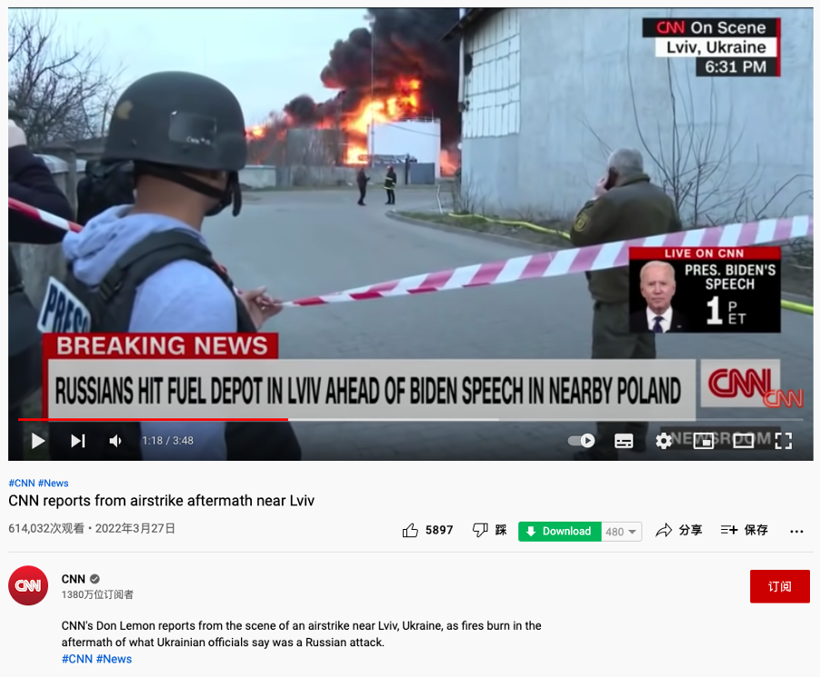 在谷歌中搜索原报道标题“CNN Team at site of explosions near Lviv”,可以在CNN的YouTube频道上找到长达3分48秒的完整版视频,发布于3月27日,其中包含了更多爆炸发生现场的细节。