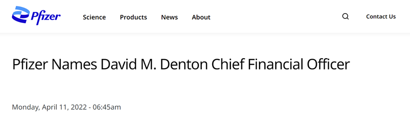 辉瑞官网发布声明,任命大卫·丹顿为首席财务官。