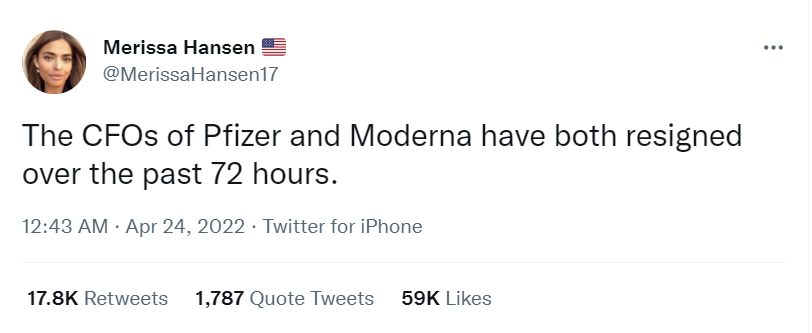 4月24日,推特上流传消息称:“美国新冠mRNA疫苗生产商辉瑞(Pfizer)和莫德纳(Moderna)的首席财务官(CFO)在过去72小时内相继辞职”。