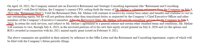 通览cfodive的文章,全文没有一处提到“辞职”等字眼,更没有消息表明德阿梅里奥和梅林会在4月24日前72小时内即4月21日至4月24日间离开公司。因此,@MerissaHansen17给出的消息源非但不能辅证其说法,反而进一步印证了其说法不足信。