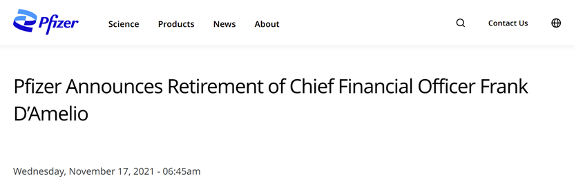2021年11月17日,辉瑞在公司官网发布公告,宣布达梅里奥将退休的消息。