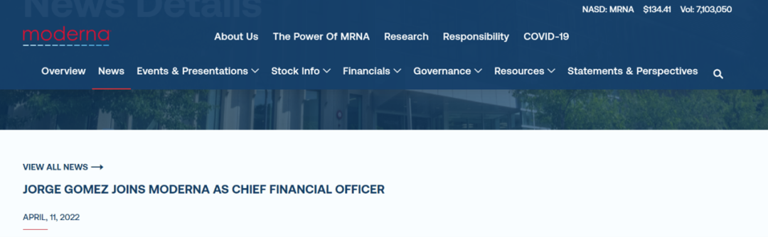 莫德纳官网宣布乔治·戈麦斯将接任首席执行官职务。