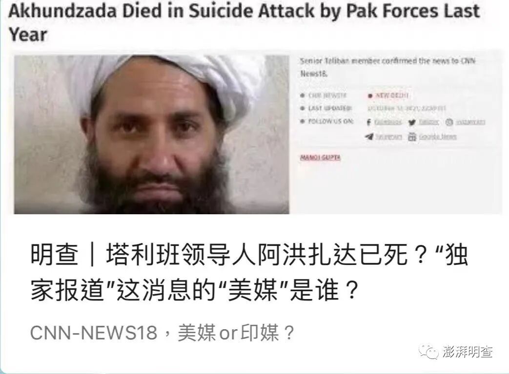 近日,阿富汗塔利班重要领导人阿洪扎达(Hibatullah Akhundzada)被一家名为CNN-NEWS18的媒体“独家报道”称已死于去年的一场袭击事件。其后,并无任何国际主流媒体转引上述报道,其原文本也在被指出存在常识错误后进行了修订,使得信源更为模糊。尽管目前围绕阿洪扎达的生死尚无进一步确切消息,“独家”披露这一“重磅”消息的媒体CNN-NEWS18却受到了广泛关注。
