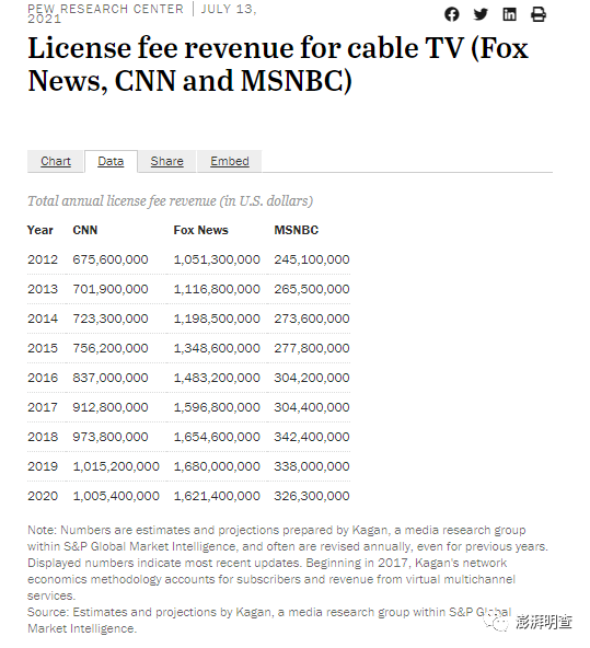 美国皮尤研究中心(Pew Research Center)在今年7月公布了一份有关美国有线电视新闻经营情况的说明,数据显示,2020年,美国三大有线电视CNN、福克斯新闻(Fox News)和MSNBC全年的总营收分别约为17亿、29亿和11亿美元。其中通过发放许可证获得的收入分别约为10亿,16.2亿和3.3亿美元,分别约占总收入的60.3%,56.1%和31%。
