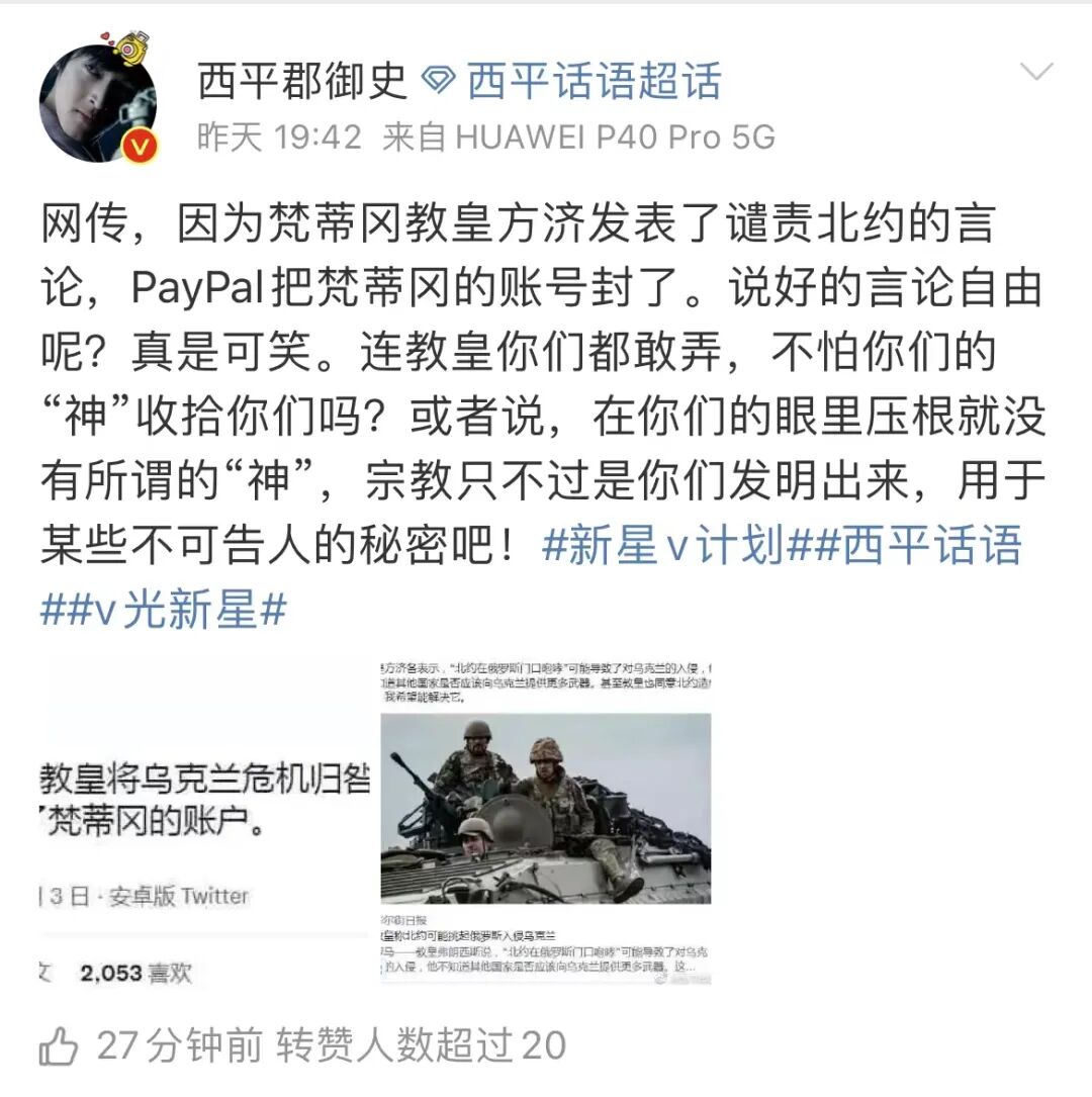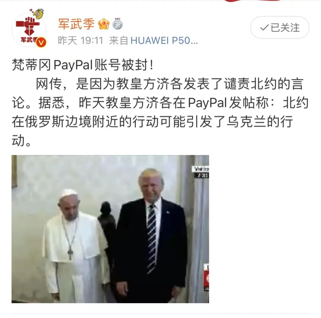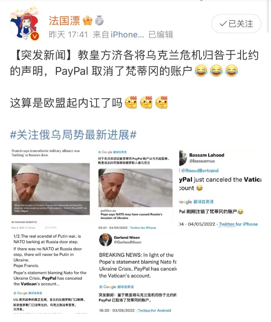 5月3日起,国内外社交平台广泛流传“突发消息”称,由于现任天主教教皇方济各(Pope Francis)发表声明“将乌克兰危机归咎于北约”,美国在线支付服务商PayPal取消了梵蒂冈的账户。