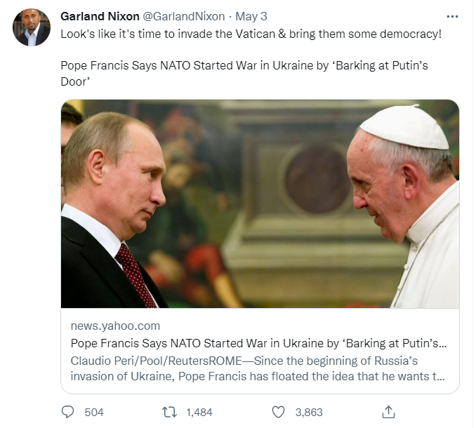 方济各的说法随后被Daily Beast等媒体传为“教皇方济各说北约‘在普京门前吠叫’,引发了乌克兰战争”,并被“雅虎网”转载。@GarlandNixon在5月3日转发了Daily Beast的文章,称“看来是时候入侵梵蒂冈并给他们带去一些民主了”,并在5月4日重提此事,说“教皇看见了现实”。