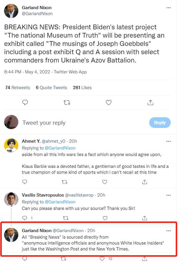 5月4日,@GarlandNixon还发布了另一则与拜登有关的“突发新闻”,称“拜登总统的最新项目 ‘国家真相博物馆’将推出一个名为‘约瑟夫·戈培尔(编者注:纳粹德国时期的德国国民教育和宣传部部长)的冥想’的展览,且包括一个展览后与乌克兰亚速营的部分指挥官进行问答的环节”。在这一堪称“洋葱新闻”的“突发新闻”下,@GarlandNixon留言道,他的“所有‘突发新闻’的信源都直接来自于‘匿名情报官员和匿名白宫内部人士’,就像《华盛顿邮报》和《纽约时报》一样。” 讽刺意味可谓明显。
