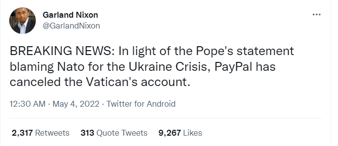 网传消息均未提供具体信源。多人在发布相关消息时展示了一张来自推特的截图,显示推特用户@GarlandNixon在北京时间2022年5月4日上午12时30分发布了一则“突发新闻”,称“鉴于教皇将乌克兰危机归咎于北约的声明,PayPal已取消了梵蒂冈的账户。”