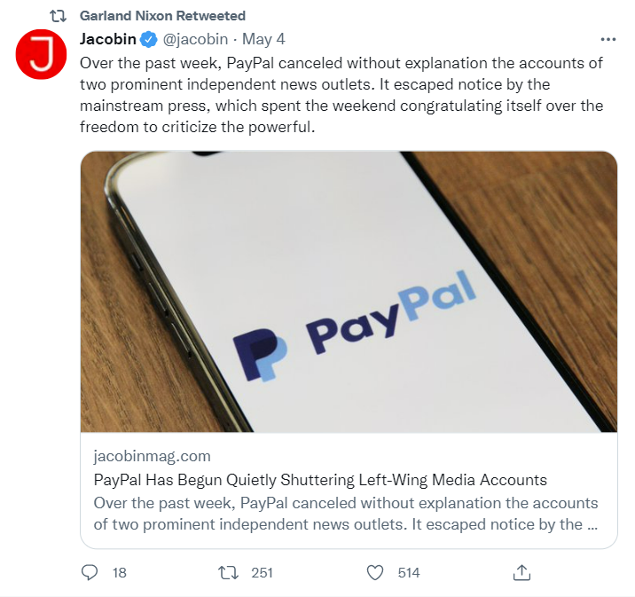 5月4日,@GarlandNixon转推的《雅各宾》杂志的推文与PayPal有关。