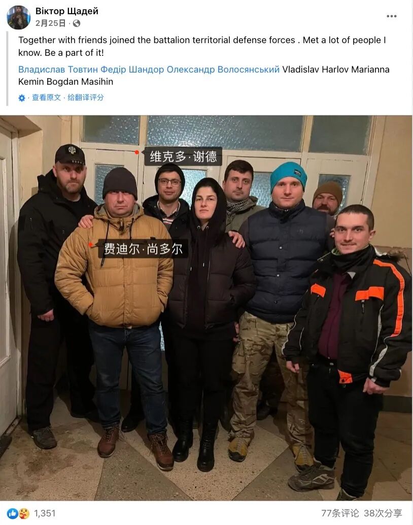 即便在其入伍之后,尚多尔的个人脸书账号仍十分活跃,甚至保持一天多次更新的高频率。从他的脸书时间线中,读者可以一窥他这两个多月以来的军旅生活碎片:2月26日,他表示自己正在“领土防御营”。起初在乌克兰西部边境、与匈牙利接壤的喀尔巴阡鲁塞尼亚(Transcarpathia)地区服役,后转至东乌克兰。