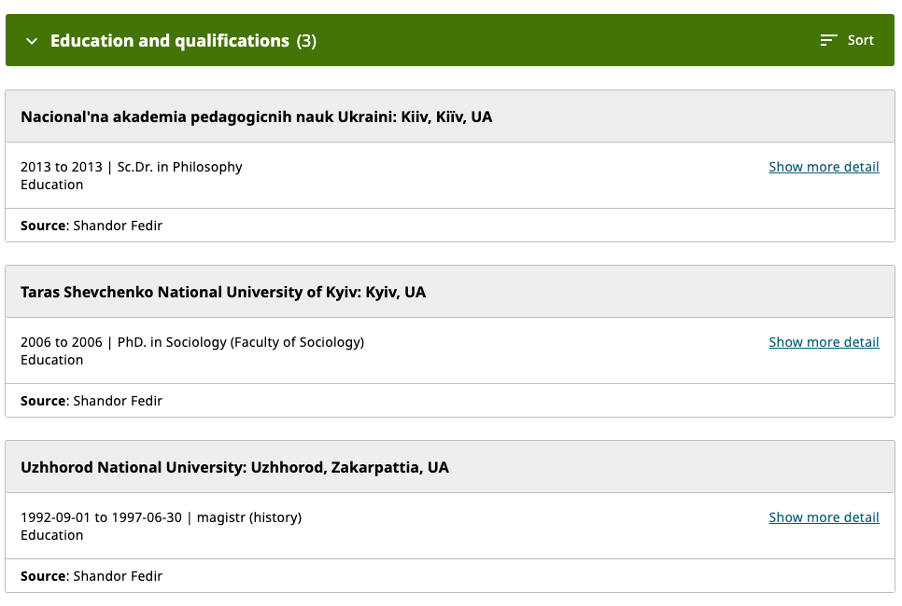 尚多尔的ORCID主页显示,他于2006年在基辅塔拉斯·谢甫琴科国立大学获得社会学博士学位,2013年被乌克兰国立教育学院授予哲学博士学位。ORCID全称为“开放的研究者和贡献者身份识别码”(Open Researcher and Contributor ID),是一个连接全世界范围内研究人员、研究组织、研究资助者和出版商在内的一系列利益攸关者,并为他们提供服务的非营利组织。简单来说,ORCID可以被理解为一种“学术身份证”,基于学术研究活动生成数据库,跟踪研究者的研究成果。