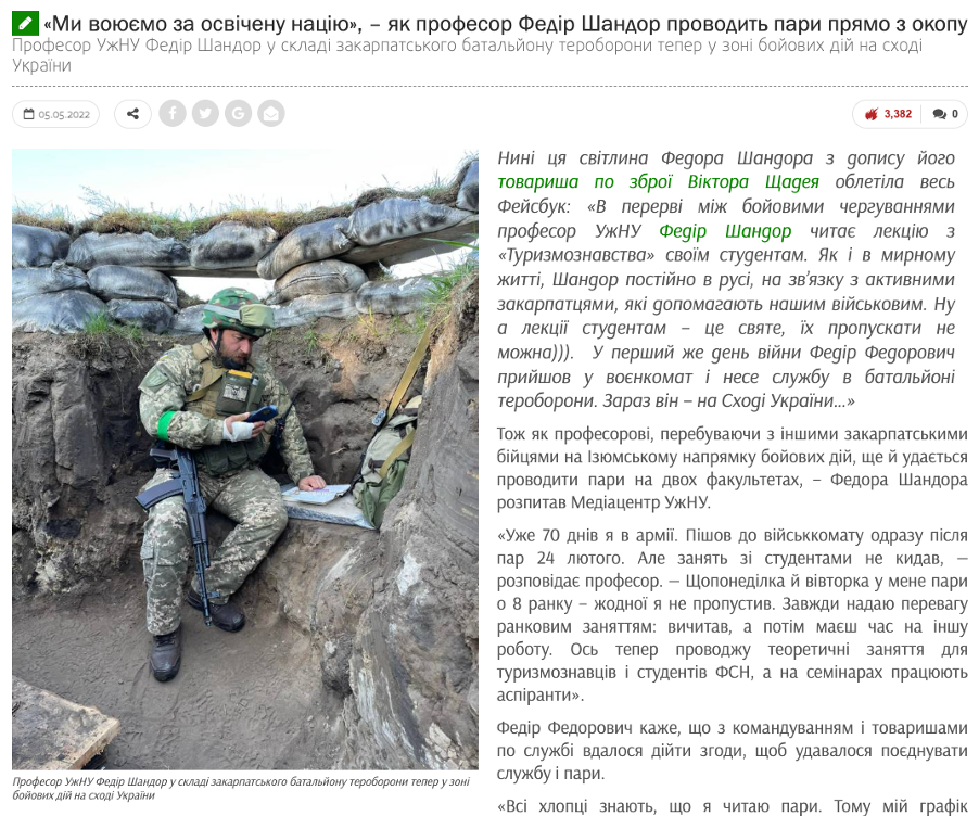 综上所述,网传“乌克兰大学教授战壕里上网课”消息可信。费迪尔·尚多尔来自乌克兰西部城市乌日霍罗德,在乌日霍罗德国立大学社会学和社会工作学习任教。他持有社会学和哲学两个学科的博士学位,近年来的研究主要聚焦在旅游社会学领域。照片的拍摄人是乌日霍罗德市前任市长、著名记者维克多·谢德,两人一同于今年2月25日入伍,加入“领土防御营”。