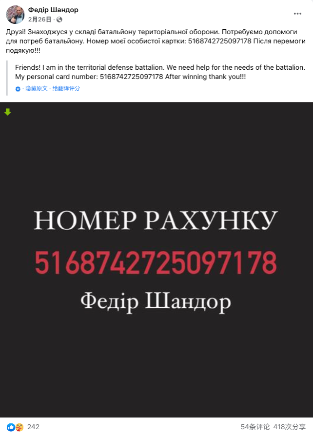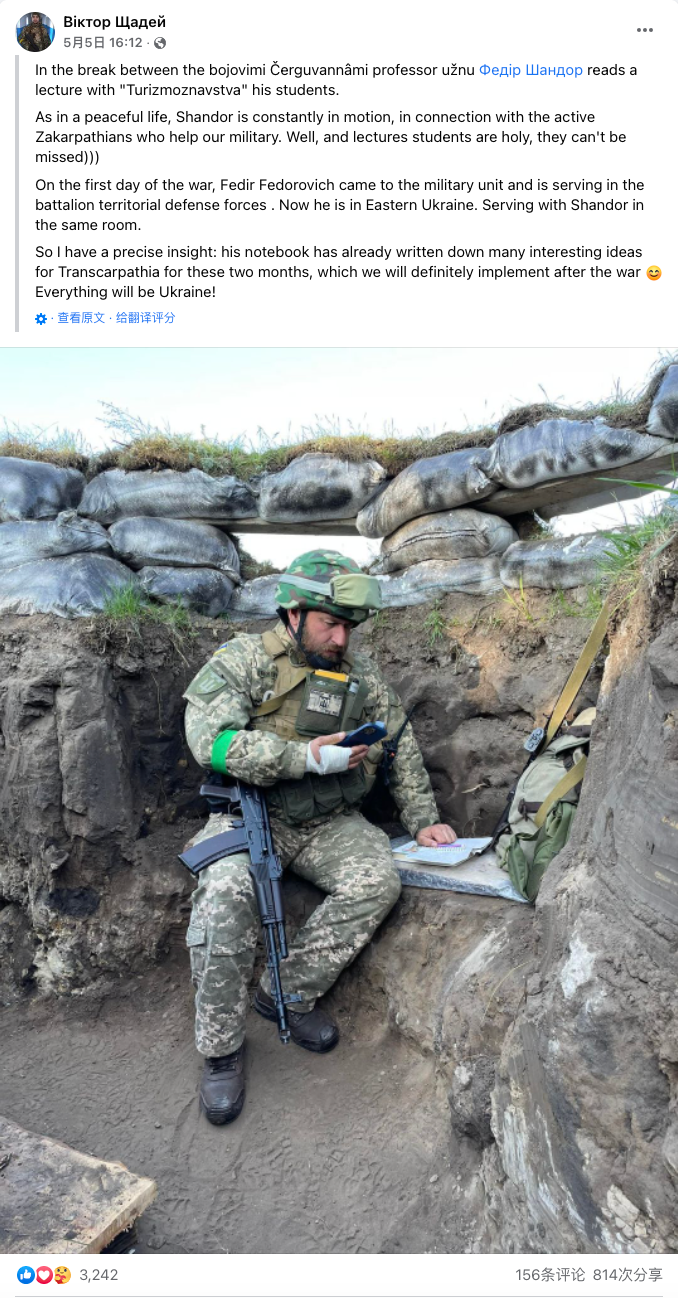 照片由维克多·谢德拍摄并上传至脸书。谢德是乌日霍罗德市前市长、知名记者,他与费迪尔·尚多尔教授一同于今年2月25日入伍,加入“领土防御营”。