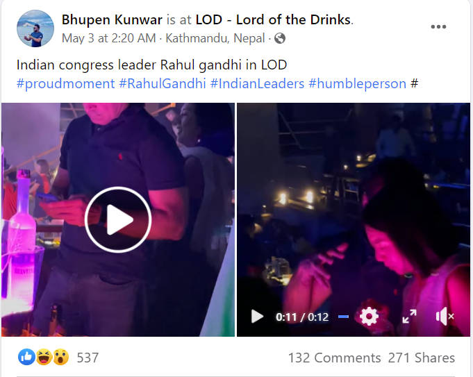 搜索脸书上与“拉胡尔·甘地”相关的消息,将地点定位在加德满都,可以发现北京时间5月3日2时20分,一位叫Bhupen Kuwar的脸书用户在平台上传了两段时长分别为12秒和11秒的视频。相关文字说明称印度国大党领袖拉胡尔·甘地现身于LOD(Lord of the Drinks)——尼泊尔当地的一家夜总会。